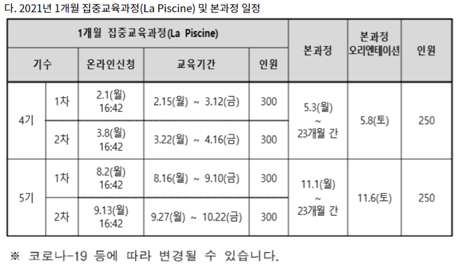 3. La Piscine(1개월 집중교육과정) : 2,3 각 1회 -> 한달간 진행 -> 본교육(23개월까지)